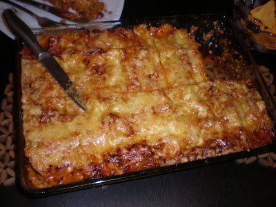 Huvudrätten var Tacolasagne! Kanske inte den lyxigaste bjudmaten, men absolut den godaste! Hela familjen är tokiga i detta recept som jag kommit på själv. Du gör en vanlig lasagne förutom att du har i tacokryddmix i köttfärsen, en hel röd parika delad i stora bitar, en hel rödlök delad i stora klyftor, fefferoni nerklippt i lagom stora bitar och lite creme fraiche och tacosås utklickat lite här och var. Till detta kan du servera en sallad. Godaste receptet ever!